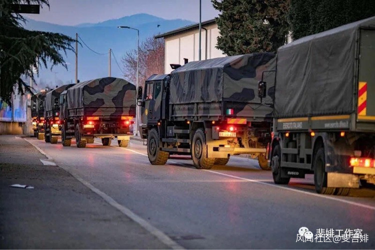 圖解:3月18日破曉時分,15輛軍車滿載而出,緩緩向南行駛至鄰近的Emilia-Romagna大區的博洛尼亞市,軍車上裝載的是沉甸甸的棺木,共65副,那是無處安放的靈魂,那是該城市無法容納和火化的屍身,因為,感染新冠病毒而離開人世的病患太多了,貝加莫的殯葬系統都崩潰了,每天排着隊火化的屍體都來不及處理,只能出動軍車把屍體運送到其他城市進行火化,然後把骨灰一一交還給死者家屬。這已經是比較當地殯儀館可以提供的人性化解決措施了。