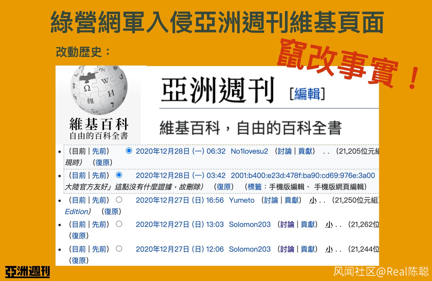 官網遭黑客入侵前,《亞洲週刊》的維基百科詞條也曾遭人惡意篡改,篡改後的“整段陳述傾向綠營利益,疑似是綠營網軍所為”。