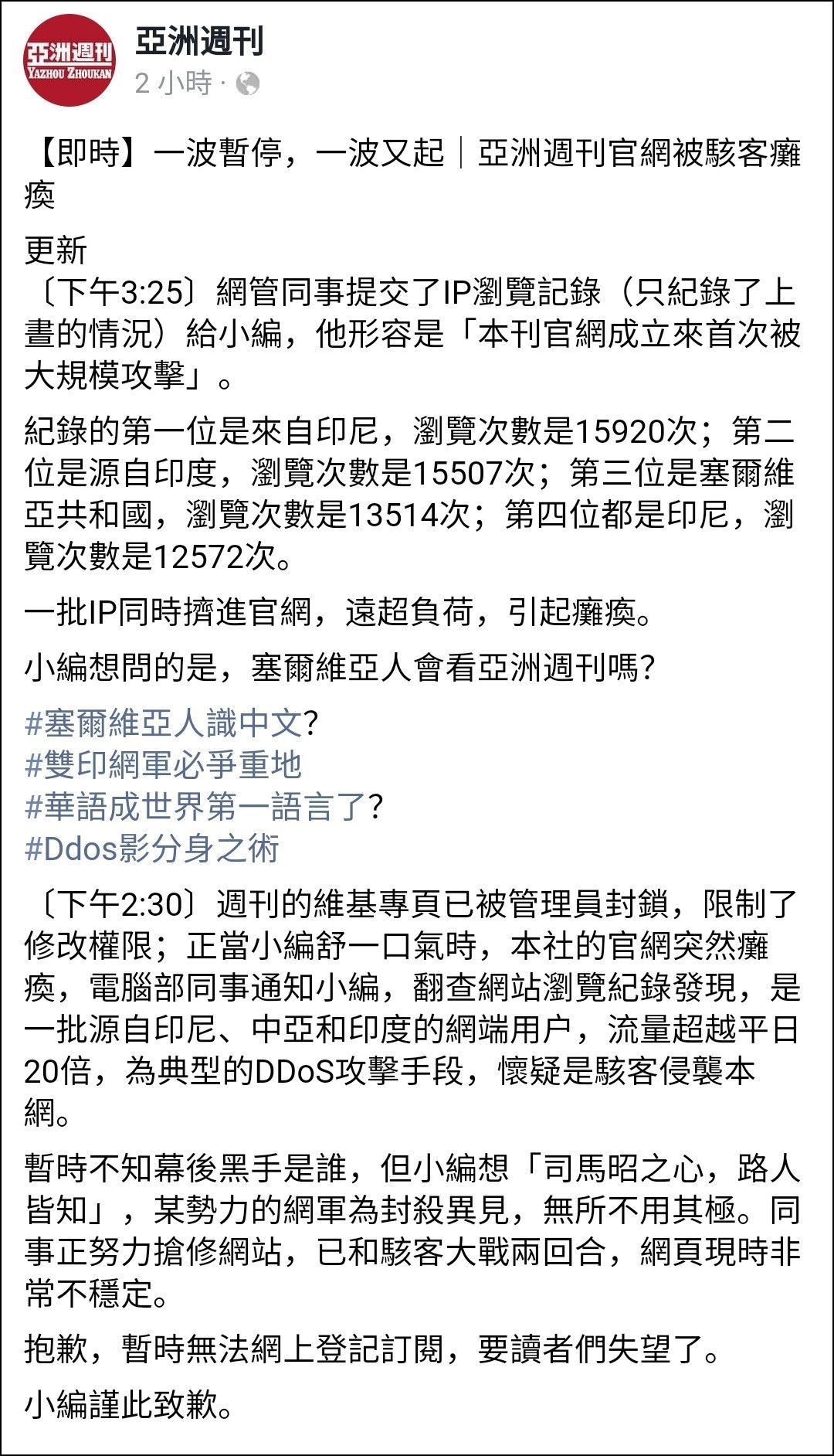 相關動態中,《亞洲週刊》的小編稱,下午2時30分許,他們的官網突然癱瘓。電腦部同事反映,“翻查網站瀏覽紀錄發現,是一批源自印尼、中亞和印度的網端用户,流量超越平日20倍,為典型的DDos攻擊手段”。