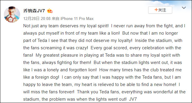 喬納森表示,不是每個隊都值得他的忠誠,他和天津泰達到此為止了,“我從來不逃避戰鬥,每次我都會像雄獅一樣衝在隊伍的最前面。在泰達,最棒的事情就是和球迷一起展示對球隊的忠誠,為了球迷而戰。但當球場的燈光熄滅時,我卻像是一隻被遺忘的獅子,有多少次俱樂部把我當做是外國狗來對待。”