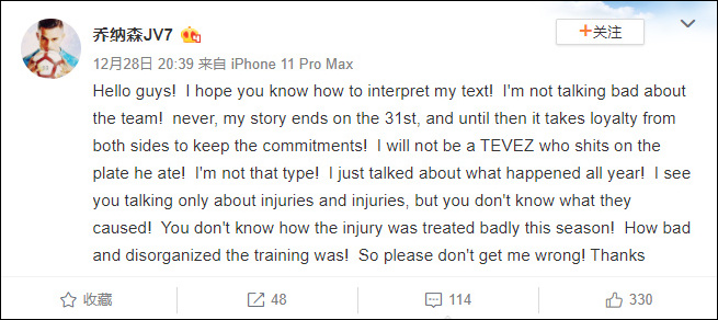 在喬納森的第二條微博中,他指出球隊的訓練方式和治療方案是他傷病的主要原因。