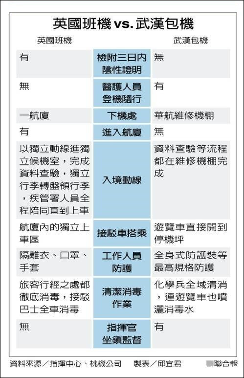 聯合新聞網特別製作了在英國班機和武漢包機兩件事情上的對比圖,諷刺台當局做法雙標。