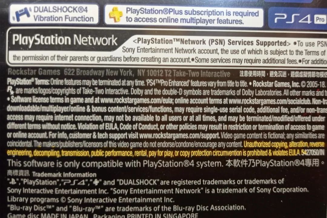 PS4版《荒野大鏢客:救贖2》光盤後面黃字列出的禁止項目