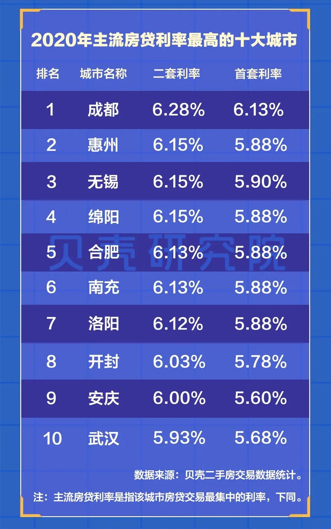 可以看出,房貸利率最高的是成都,首套房貸利率高達6.13%,相比基準高出148個基點;最低的為上海,首套房貸利率僅為4.65%,與基準持平。