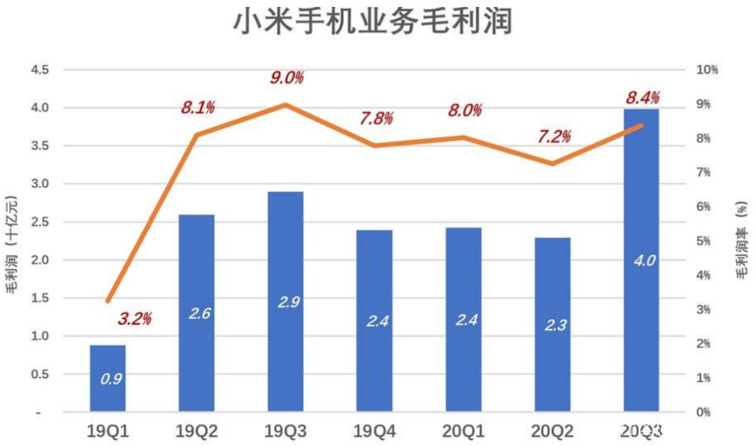 在2020年第三季度,手機硬件貢獻了476億的營收以及39.8億的毛利潤。