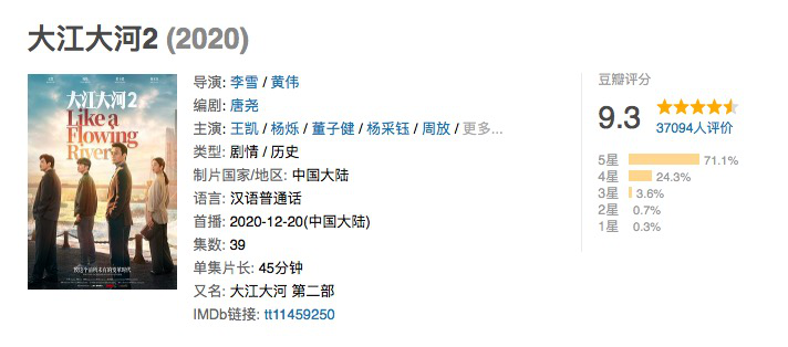如無太多意外,《大江大河2》應該會是2020年度最佳口碑劇集:歲末最後10天超越《沉默的真相》的豆瓣9.2分,該劇以豆瓣開分9.4分,如今劇集更新近三分之一評分仍然穩穩落在9.3分,好評率超95%的成績,後來居上,搶佔豆瓣劇集口碑榜TOP1。