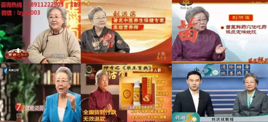 電視廣告的生猛發展,也讓禁播違規廣告充斥着電視熒幕。其中最著名的一個事件就是,“劉洪濱(斌)老大媽”一人扮演“苗醫鮮藥傳承人”、北大專家、老苗醫傳人、蒙醫傳人、中華醫學會鎮咳副會長、東方咳喘研究院副院長等九種專家身份,活躍於20多個電視台,拍攝各種假藥廣告,被網友戲稱其為兢兢業業的假藥廣告表演藝術家。