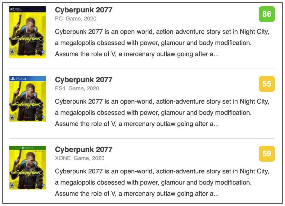 這樣的優化表現無法令人滿意。在眾測平台 Metacritic 中,PS4/XBox One 雙版本的媒體評分均在及格線以下;玩家評分則亮起了紅燈,只有5分不到(滿分10分),人們把憤怒指向了 CDPR 在宣發上的誤導。