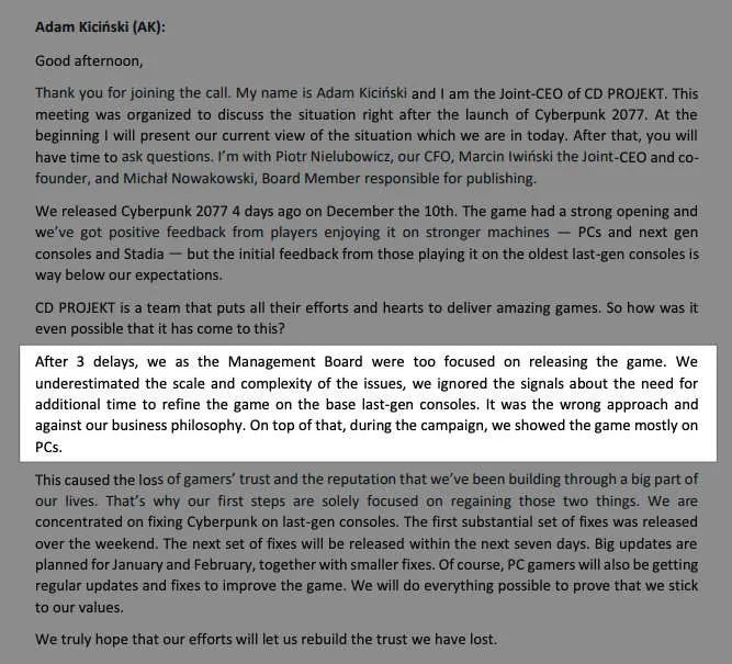 作為當事人,CDPR 的 首席執行官 Adam Kiciński 對爭議做出了一番解釋:「在經歷三次延期之後,管理層過於專注於發佈遊戲。我們低估了問題的規模和複雜性。我們忽視了關於需要更多時間在上一代遊戲機的基礎上完善遊戲的信號。」