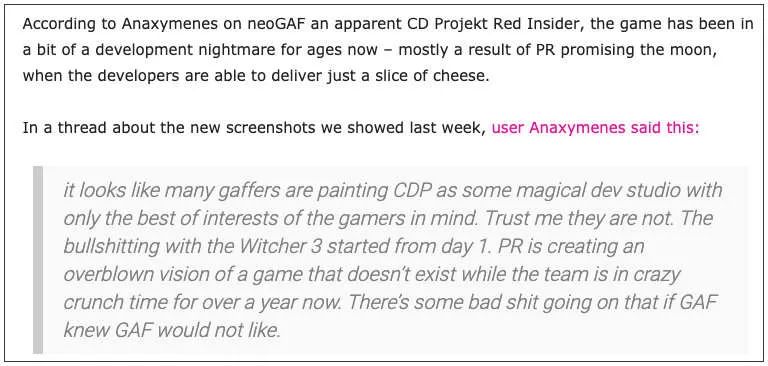 就像《2077》一樣,《巫師3》在發售之前,就已經揹負着外界的質疑。2014年,一位 ID 為 Anaxymenes 的用户以「業內人士」身份在遊戲論壇 NeoGAF 進行爆料。據他聲稱,《巫師3》打從項目公佈的第一天開始,就在通過宣發來製造假象,而遊戲的實際品質未必如人們預期中的那麼好。
