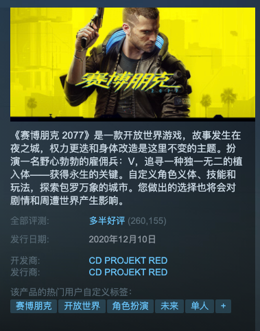 實際上,參照《巫師3》的宣發,我不覺得 CDPR 營銷過剩。為博人眼球,各家遊戲廠商多少會有「畫餅」行為,而《2077》在宣傳上更多是揚長避短,不至於像《無人深空》那樣給出了近乎錯位的營銷。事實上,《2077》的口碑還不至於整體崩盤,在 Steam 平台上,遊戲便處於多半好評的狀態。
