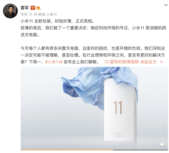 小米 11 的包裝盒裏的確是不再附帶充電器了。