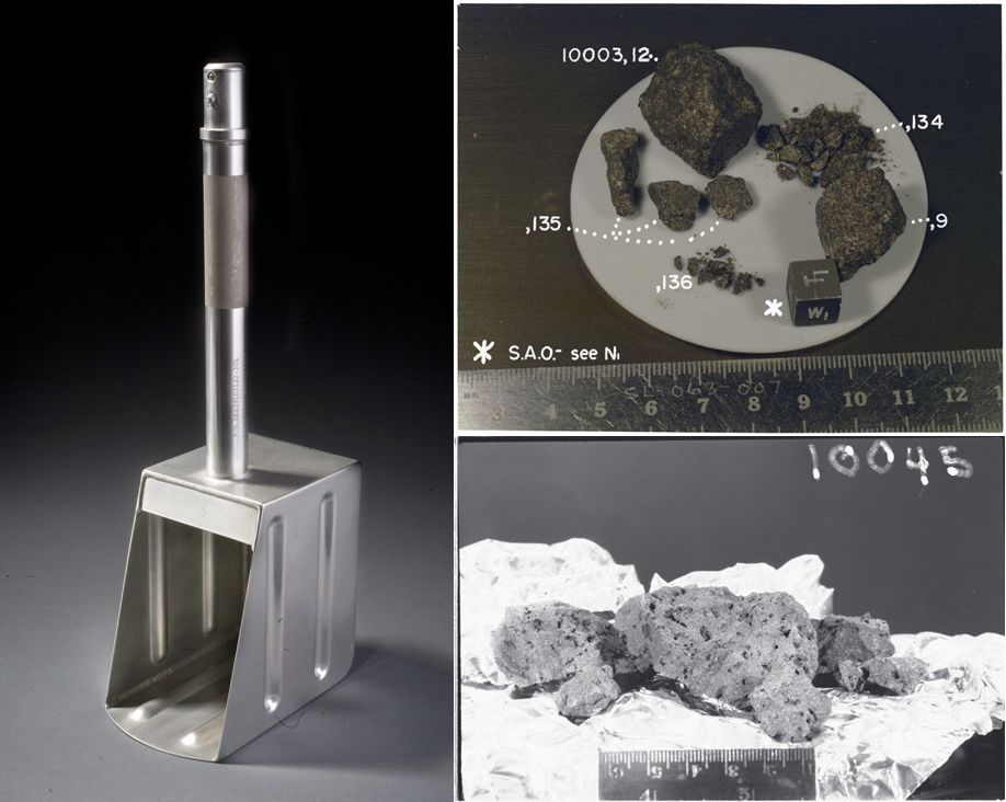 阿姆斯特朗完成第二次採樣所用的鏟子和採回的樣品示例 | 美國國家航空航天博物館&NASA