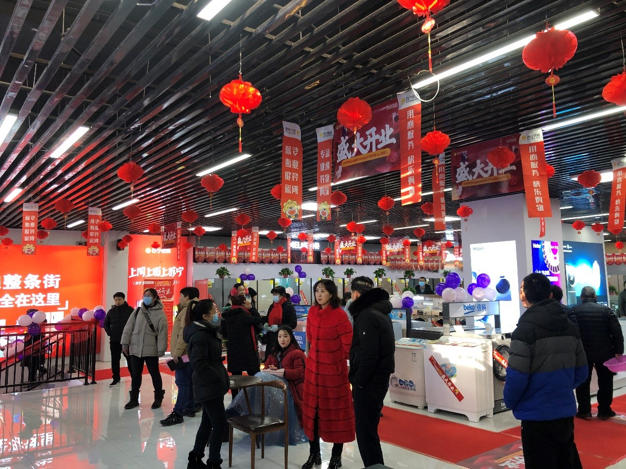 房國棟的第二家蘇寧零售雲店面積不大,佔地大概超700平,坐落在平頂山市魯山縣人民路上,這可謂是當地寸土寸金的核心商圈,周邊店面也都是蘇寧的“老朋友”,有海爾、美的的專賣店,也有京東家電、天貓優品等新零售門店。