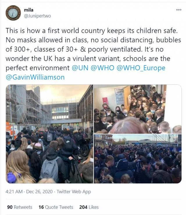 一位名叫米拉(mila)的倫敦網民貼出的一組圖片就顯示,一些英國中學此前就未能讓學生們保持社交距離,還出現了學生在密集的教學樓裏大量聚集的危險場景。