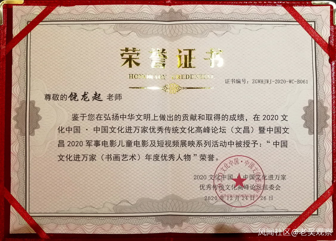 從一個大別山區有志青年,到一名光榮的解放軍戰士,從一個退伍老兵,到一名有成就的書法家,成功之門,永遠向堅持不懈勇於攀登者敞開,面對一摞摞用心血和汗水換來的榮譽,饒龍起又有新心願,那就是發揮餘熱,有生之年,把自己練就的書畫藝術傳授給下一代,讓更多人享受中國書畫藝術的魅力。吳賢德文/圖