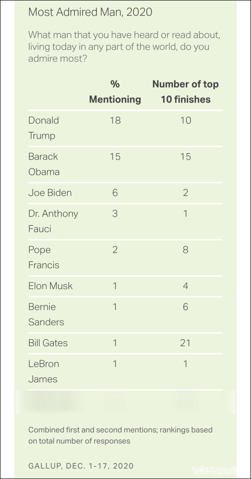 在兩人之後,當選總統拜登(6%)和傳染病專家安東尼·福奇(3%)分列第三和第四名。教皇方濟各、佛蒙特州獨立參議員伯尼·桑德斯和微軟創始人比爾·蓋茨也有上榜。
