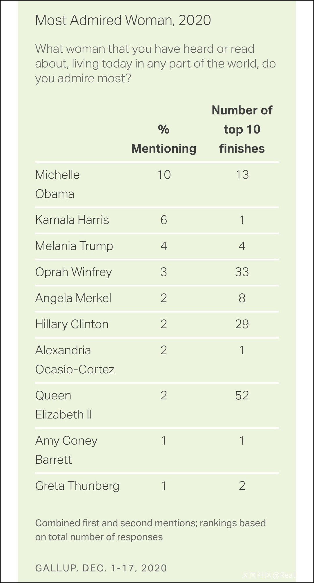 女性方面,米歇爾·奧巴馬連續第三年登頂,今年她的支持率是10%。當選副總統卡馬拉·哈里斯和第一夫人梅拉尼婭·特朗普分別以6%和4%的支持率排在第二和第三名。