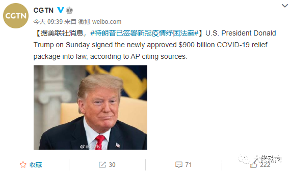 0112月27日晚,美國白宮證實,美國總統特朗普簽署了總額達2.3萬億美元的新冠疫情紓困方案和避免政府“停擺”的大規模支出法案。