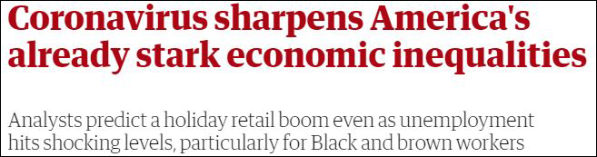 當地時間12月29日,英國《衞報》發表評論文章,稱新冠病毒加劇了美國的經濟不平等現狀。2020年年底的聖誕假期,一些人在為節日瘋狂消費;而與此同時,無數美國人正在為生計發愁。