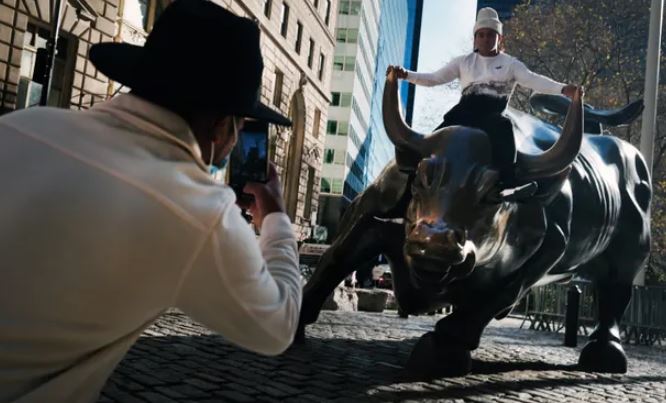 人們在華爾街銅牛上拍照,轉引自《衞報》
