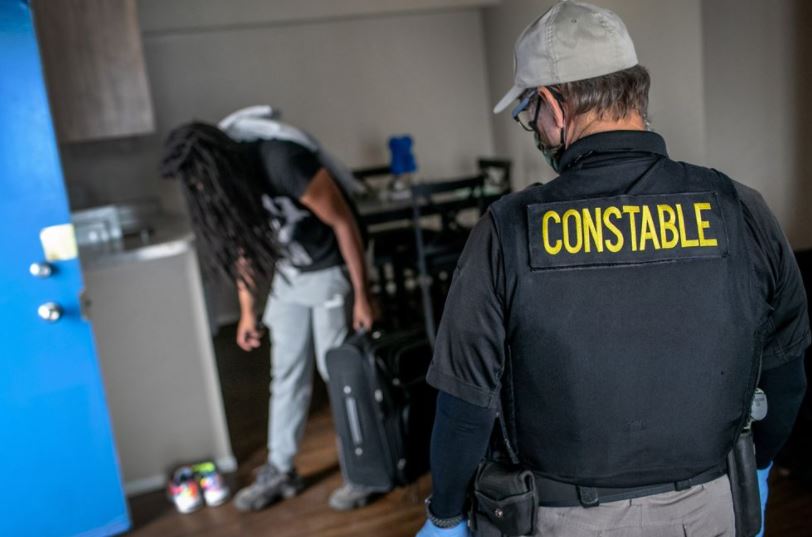 10月,馬里科帕縣的一名警察驅逐房客搬離房屋 圖源彭博社