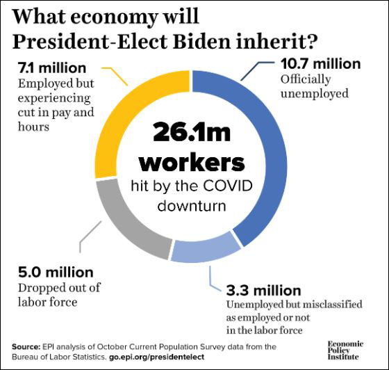 據美國勞工統計局(BLS)的數據顯示,美國11月份的正式失業人數為1070萬,失業率為6.7%。但美國經濟政策研究所(EPI)看來,工作受到實質性影響的人數其實更多——有超過2610萬人口失業或者工資遭到削減,他們佔到了全美勞動力的15.5%。