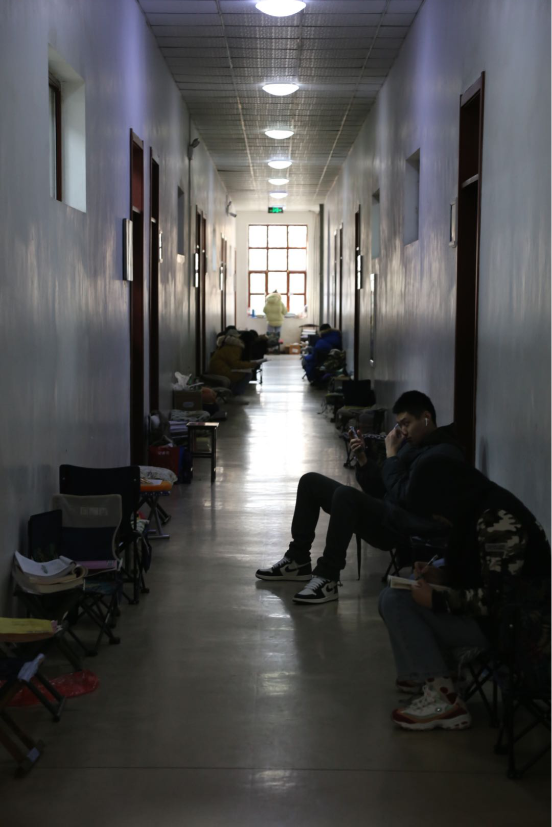 為了背書時不打擾他人,陳西和同學需要多次轉移陣地,綜合樓和行政樓四層適合安靜複習,西聯教室前的空地和老文史樓的走廊才是背書人聚集的地方。曲師大老文史樓的走廊兩側密集排列着各式馬紮,如果早上七點來到這裏,能看到很多考研學生坐在上面背書的壯觀景象。