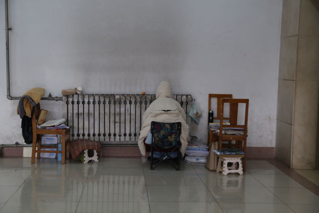 不是所有人都喜歡冬天空氣悶濁的自習室,有人佔據樓道中每一處暖氣片,穿着厚重的羽絨服,坐在小馬紮上一動不動,水壺、零食、幾疊書本圍住他們的周身,這樣就在開放空間裏擁有了一塊封閉的學習領地,像真菌一樣長在角落裏自成生態。