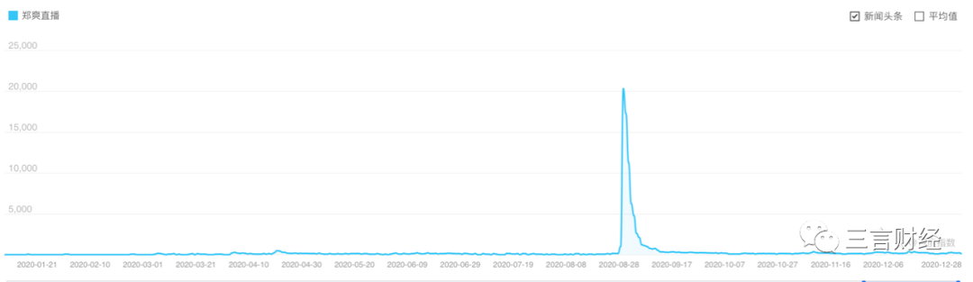 “鄭爽直播”的百度指數也表明,8月開啓直播首秀時,網友對她直播帶貨的關注熱度最高。
