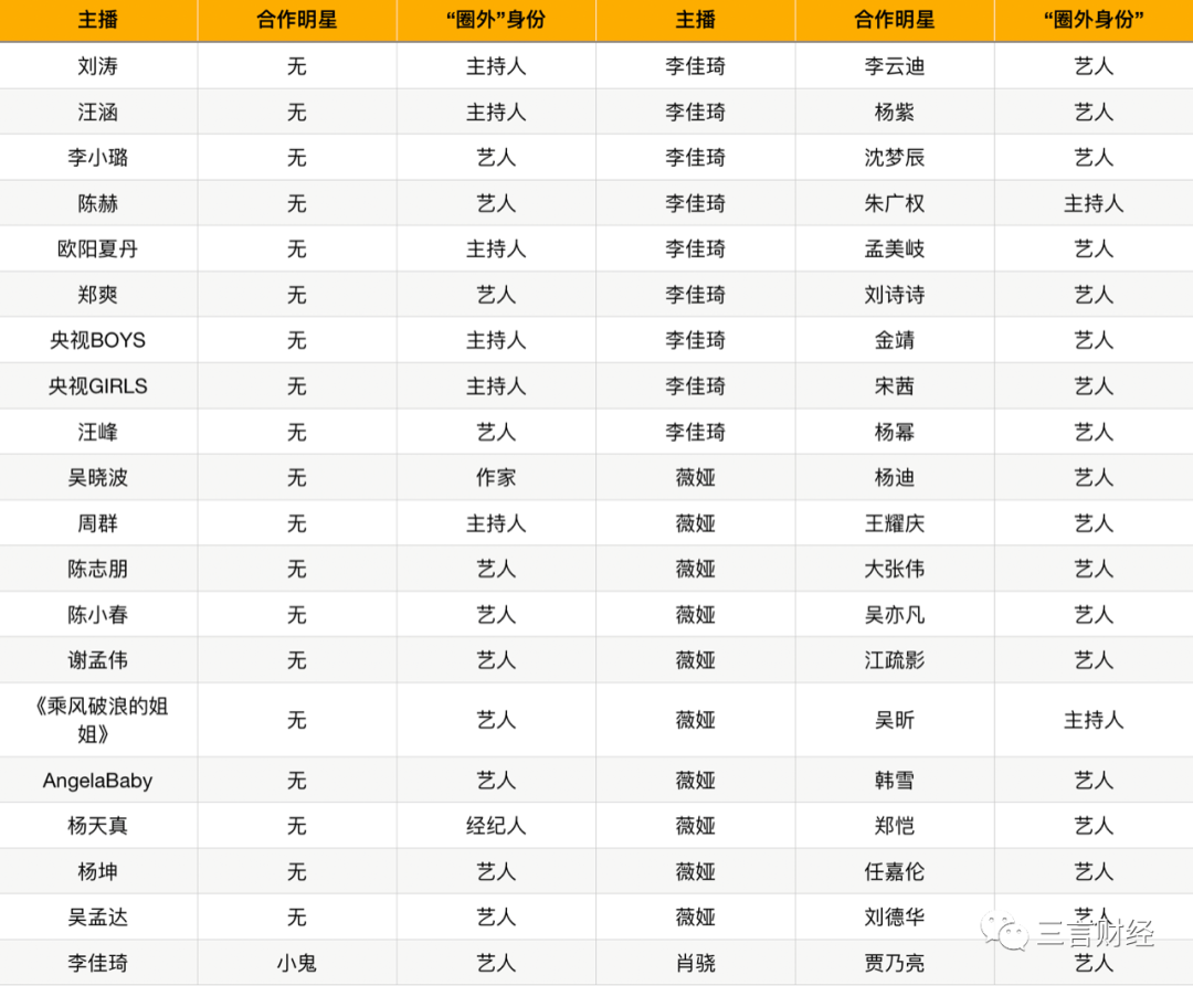經三言財經不完全統計,2020年加入直播帶貨,包括自主直播和與李佳琦、薇婭等網紅合作的明星藝人、主持人等超過40名。