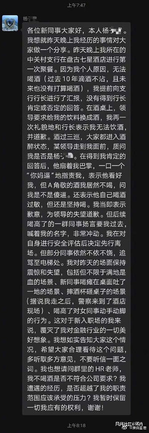 更讓人目瞪口呆的是,爆料者稱離開後,聚餐房間內還發生了摔酒杯砸桌子、對女同事動手動腳的情況,甚至招來了警察。