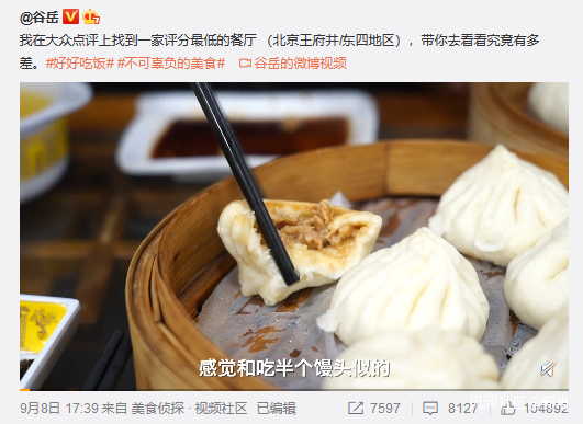 微博博主@谷嶽 發佈了一則狗不理包子北京王府井店的探店視頻,視頻中他介紹,該店在大眾點評網上的評分是2.85分,在王府井地區的餐廳中評分最低。他花60元買了一籠8個的醬肉包,又花38元買了一籠8個的豬肉包後給出差評,“要説也沒那麼難吃,這種質量20塊錢差不多,100塊錢兩屜有點貴。”
