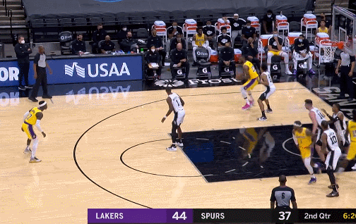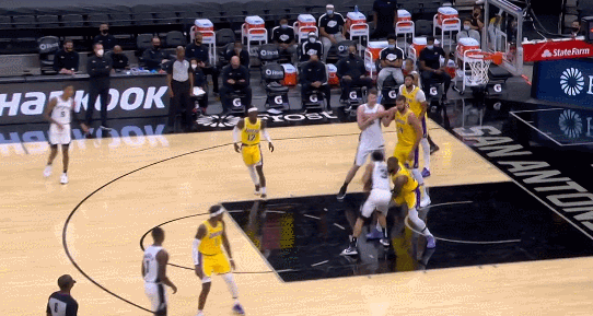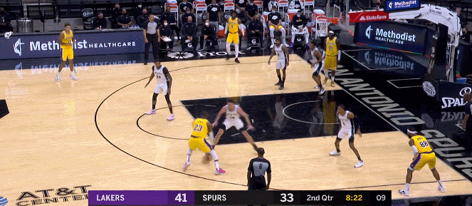 他在場上除了不讓馬刺四打五以外,實在看不出任何正面的作用。內線如此巨大的優勢,導致馬刺只得收縮,甚至用上了聯防,當詹姆斯或者濃眉在低位一拿球,馬刺又不得不來包夾,最終的結果就是湖人出現了大量空位三分的機會。