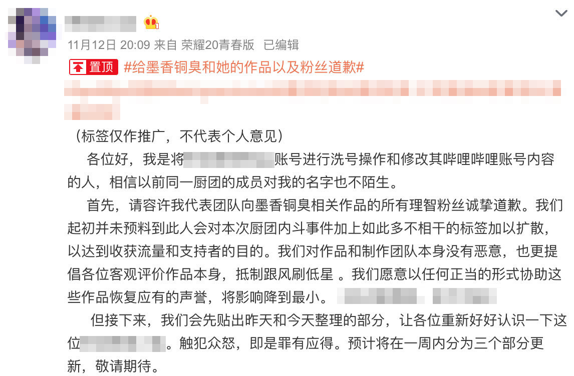 2020年11月初,也就是《天官賜福》動畫開播不久後,就有一位遊戲玩家公開指責墨香銅臭粉絲“洗號”,進而演變成大量不明真相的網友紛紛給《天官賜福》動畫打出了差評。然而出乎意料的是,這起事件的始作俑者竟然是另一位遊戲玩家,TA在微博上承認,自己這麼做的目的純粹只是為了轉移視線和扯上熱度,讓不少遊戲玩家和《天官賜福》粉絲大跌眼鏡。