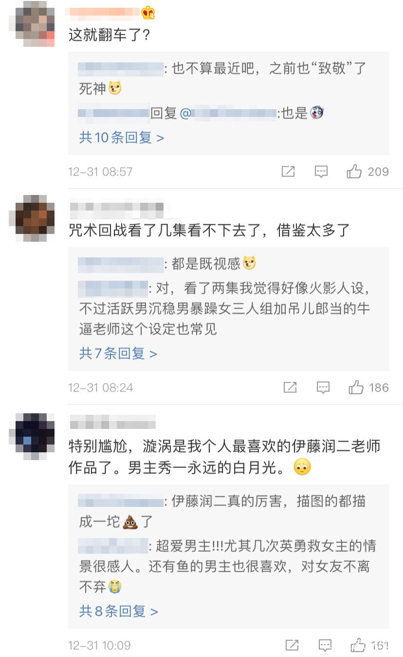 此外,近期特別熱門的《咒術回戰》,也被部分網友認為有太多《死神》《全職獵人》《火影忍者》《JOJO的奇妙冒險》等其他人氣動漫作品的強烈即視感。其中在《咒術回戰》漫畫最新更新的134話中,反派夏油傑使用的招式“漩渦”,更是被人發現與伊藤潤二的《漩渦》名場面如出一轍,在網絡上引發了激烈的爭論。