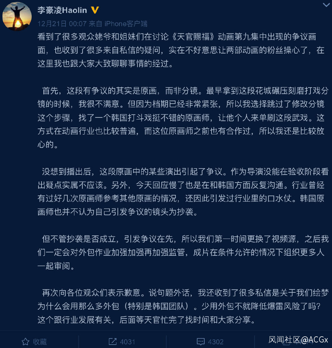 這起事件的來龍去脈其實並不複雜。簡單來説,就是有觀眾發現《天官賜福》第9集的一段3秒鐘的鏡頭,與《進擊的巨人》動畫第三季的名場面“兵長砍猴”相似,隨即在網絡上引發了大量質疑。《天官賜福》動畫導演李豪凌在微博回應稱,“作為導演沒能在驗收階段看出疑點實屬不應該”,在“第一時間更換了視頻源”,表示“一定會對外包作業加強加強再加強監管”,並“向各位觀眾們表示歉意”。