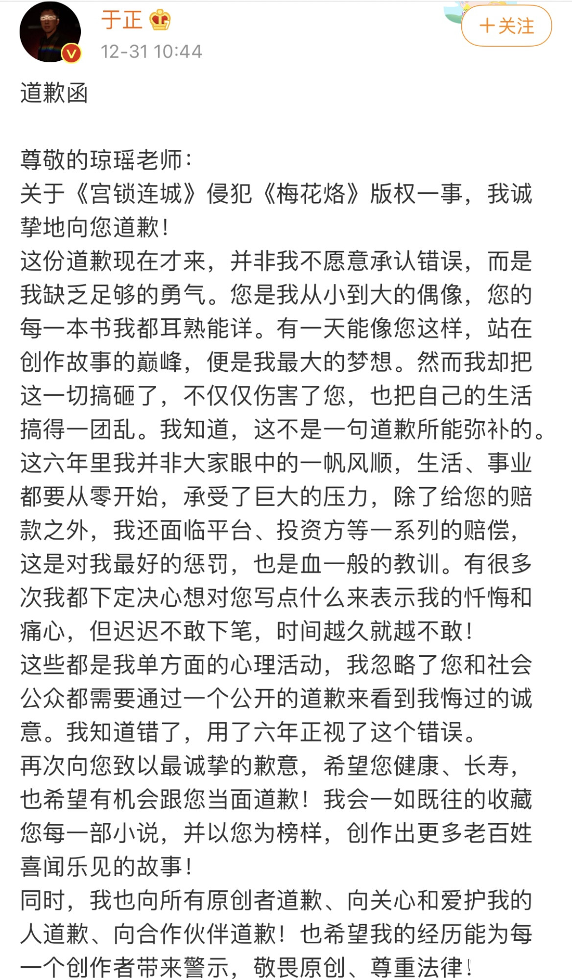 近日,其和郭敬明被國內156位編劇聯名抵制後,今天上午,於正在其個人微博為此前抄襲瓊瑤作品《梅花烙》一事道歉。