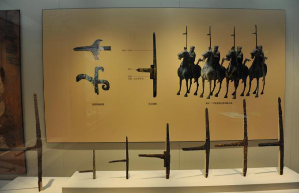 《説文解字》記載:“戟,有枝兵也。”戟形制一般是長柄杆子前面有個可以刺的尖,然後有一個開刃的橫枝。雖然商周的青銅戟多采用矛頭和戈組裝起來的分體戟頭。2007年出土於兵馬俑坑中的四年相邦呂不韋戟,就是這樣一個典型的由青銅戈、矛,以及木柄還有尾鐓四部分組成的,全長2.87米,因為木柄易腐朽,這杆帶柄的長戟就是目前國內發現的唯一一件保存完整的青銅戟。