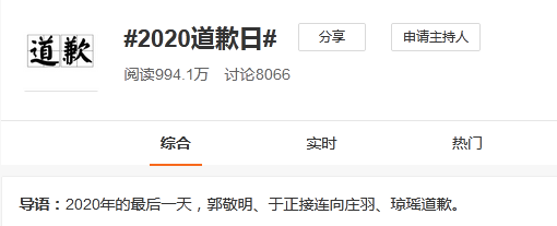 12月31日,郭敬明、於正選擇先後在微博發文道歉。