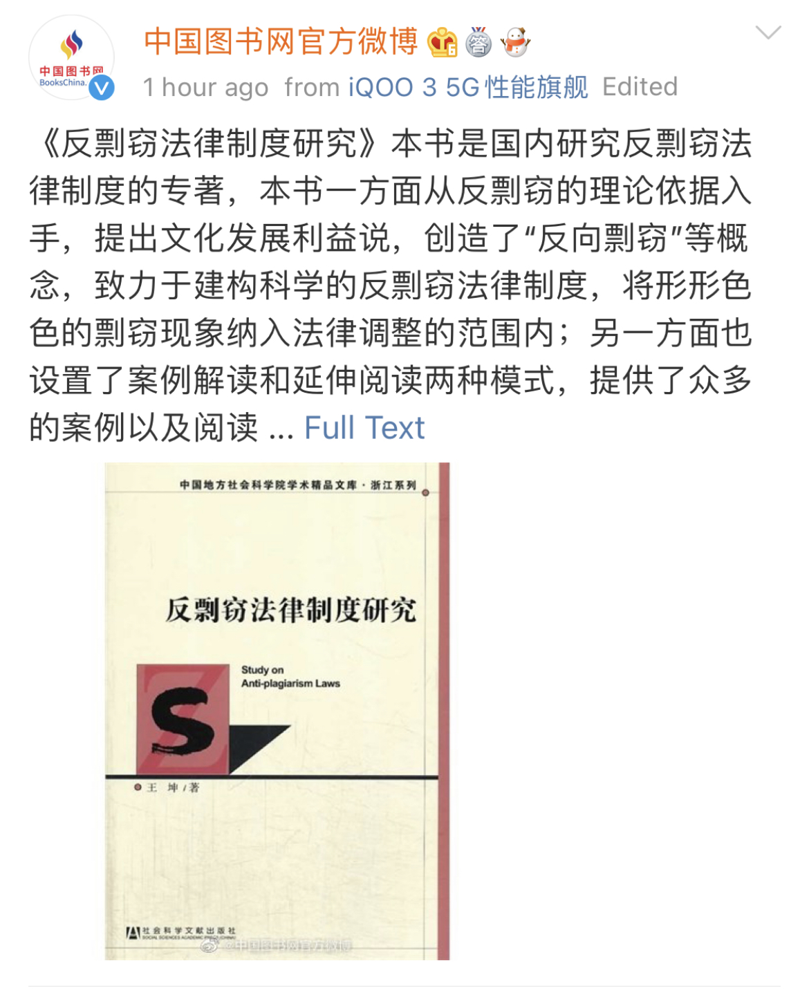 連@中國圖書網官方微博 都“緊跟時事”,趕來推銷《瓊瑤訴於正案始末》和《反剽竊法律制度研究》。
