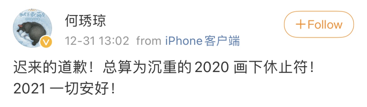 電視劇《梅花烙》製片人、瓊瑤兒媳何琇瓊隨後回應稱:“遲來的道歉!總算為沉重的2020畫下休止符!2021一切安好!”