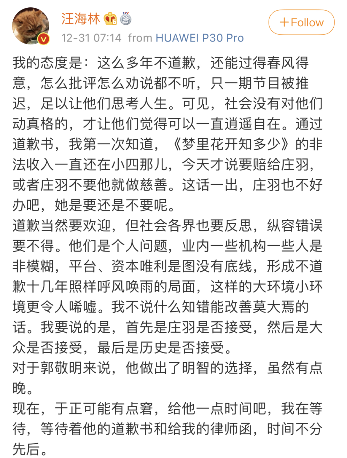 其實,早在郭敬明零點道歉後,於正就登上了熱搜,吃瓜羣眾都在等着其表態,編劇@汪海林 也在喊話之列。
