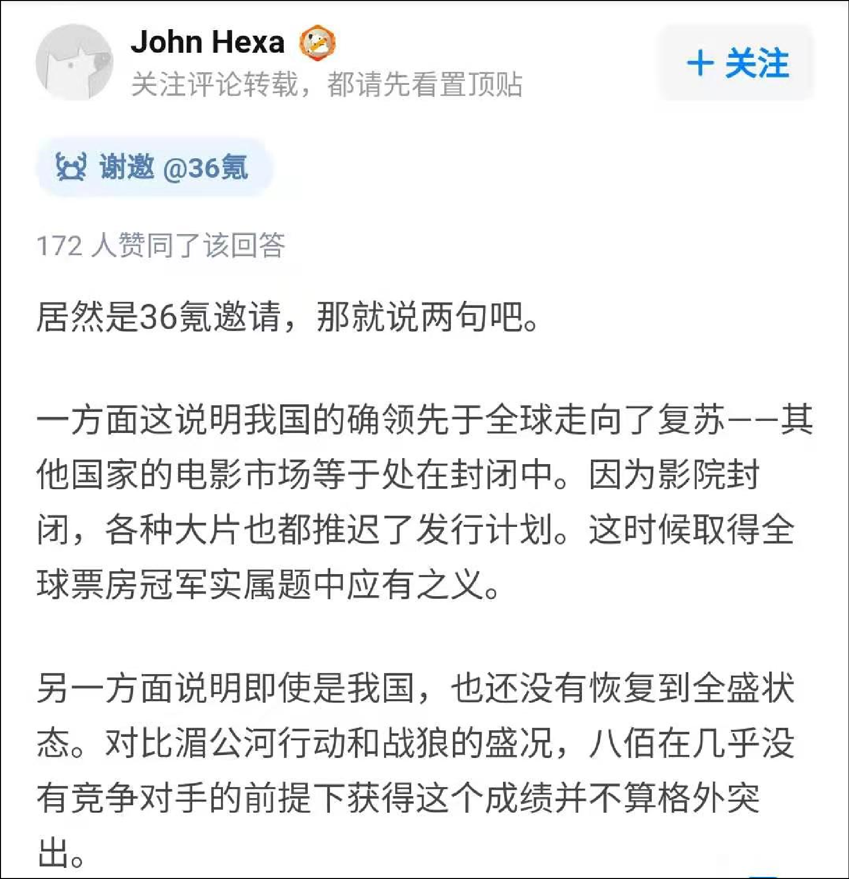 有網友就表示,《八佰》奪冠這事,與其説體現中國電影的崛起,倒不如説是體現了中國抗疫成績之卓越,成為了首個恢復正常社會秩序的國家。