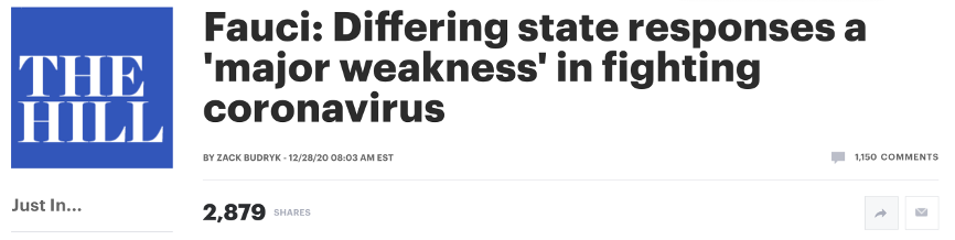 28日,美國傳染病專家安東尼·福奇在接受英國廣播公司(BBC)採訪時表示,美國缺乏統一的疫情應對措施和標準,各州政策差異巨大,缺乏連續性,這成為美國在疫情應對中的“主要弱點”。此外,美國將公共衞生問題政治化,也是導致美國新冠肺炎疫情失控的重要原因。