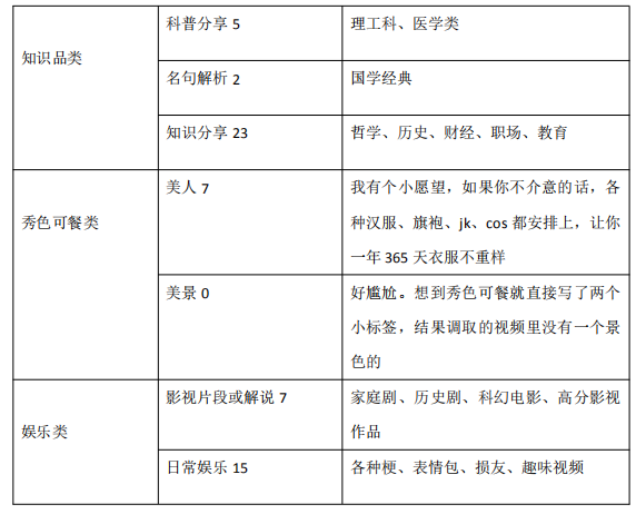 打開喜歡頁面,一屏可以看到9個點讚的視頻,選取規則:連續四屏最近的點贊,然後閉眼隨意下翻,隨緣而定選取一屏,如此七次,共十一屏99個小視頻。如果某個小視頻有兩個及以上的屬性,則分別計數,所以分類總數會超過99。