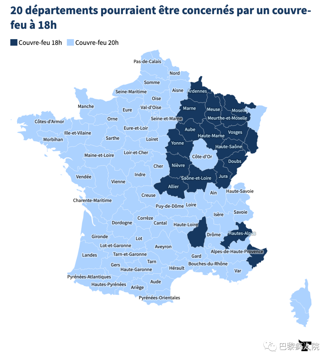 具體的名單將於1月1日根據最新數據擬定,但法媒都表示,在目前受疫情影響最大的四個地區,也就是le Grand Est, la Bourgogne-Franche-Comté, l’Auvergne-Rhône-Alpes和les Alpes-Maritimes,約有20個省是大概率逃不掉,肯定實行宵禁提前的新措施了。