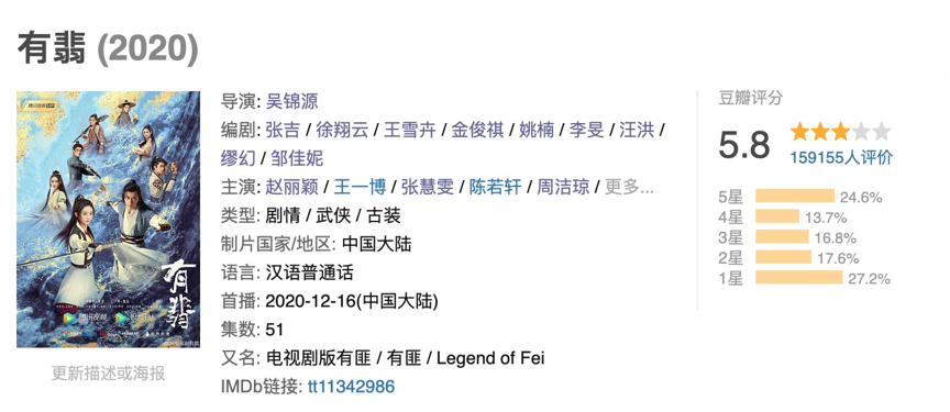 今年最具爆款相的《有翡》空降年末,被業內給予厚望重現去年同期《慶餘年》的輝煌。結果一開播,口碑就以迅雷不及掩耳之勢全面崩盤了,豆瓣開分6.3,現已降到5.8。