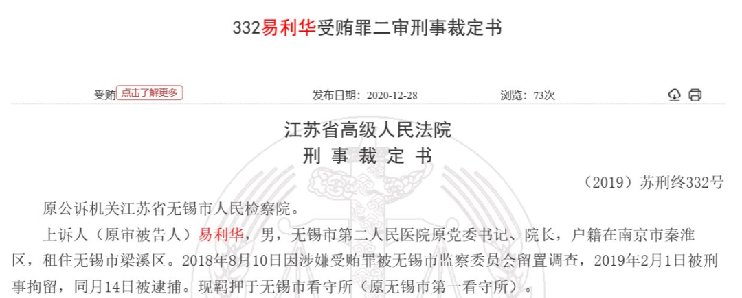 這份裁決書中的主人公,是曾經在2020年初上過中紀委國家監委電視專題片《國家監察》的“反面典型”:無錫市第二人民醫院原黨委書記、院長易利華。