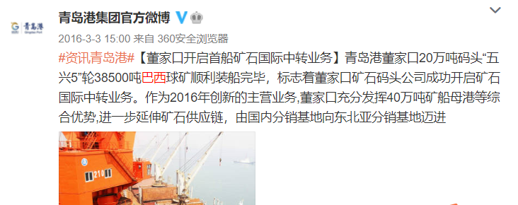 第二,我們從青島港的類型來看,它是工業港,是原油和鐵礦石的進口主力 。